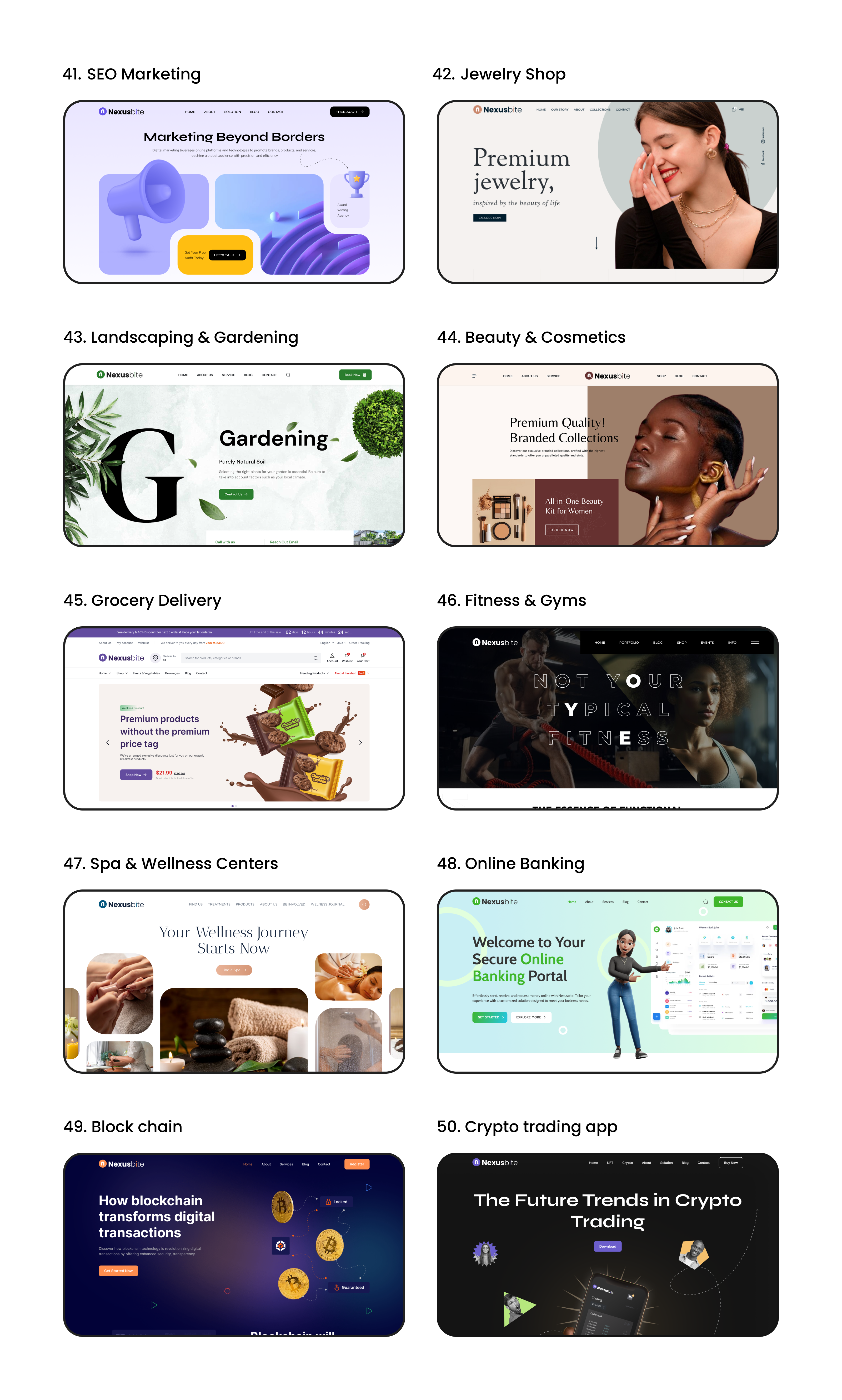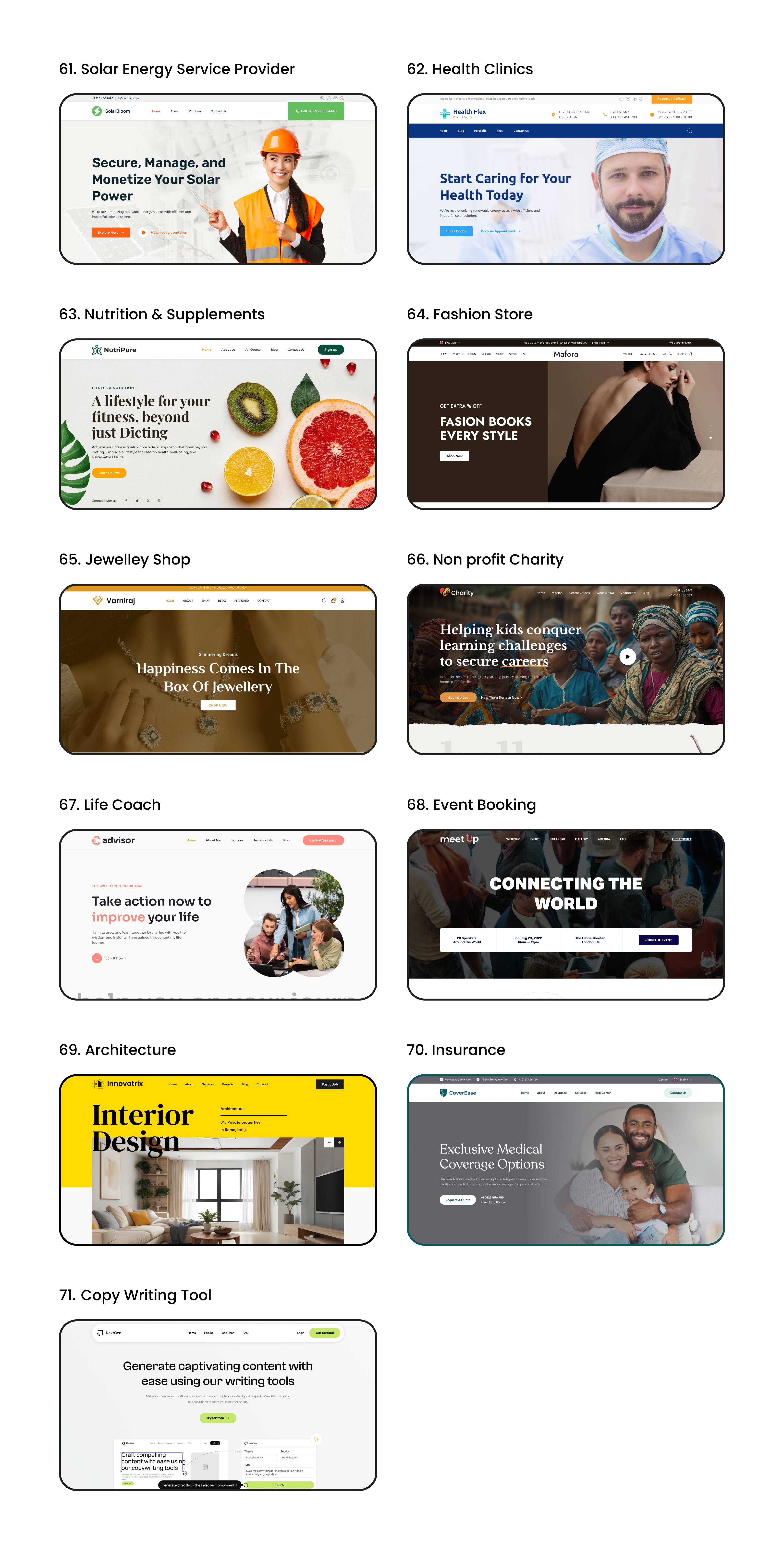 - Variety of Designs: Includes 70+ diverse templates catering to various industries, such as e-commerce, real estate, tech startups, creative portfolios, and more.